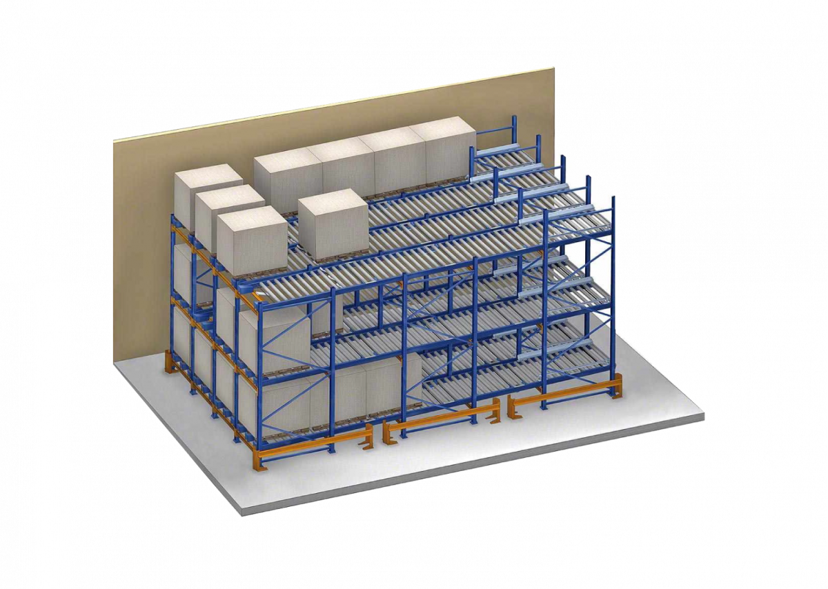 Sistema de almacenaje por acumulación que permite almacenar hasta cuatro Pallets en fondo por cada nivel. Todos los Pallets de un mismo nivel, a excepción de la última, se asientan sobre un conjunto de carros que se desplazan, por empuje, sobre los rieles. Ideal para el almacenaje de productos de media rotación, con dos o más Pallets por referencia (sistema LIFO).